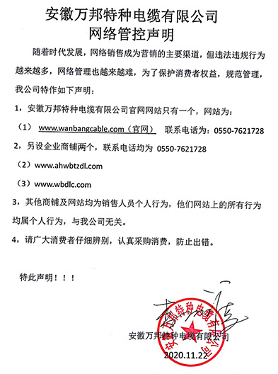 鄭重聲明:安徽萬邦特種電纜有限公司官方網站為:www_wanbangcable_com.weimeimc.com,除此之外無任何子網站或合作網站,其余均為假冒偽劣。電話:0550-7621728 13485756353 地 址:安徽省天長市滁州高新技術產業開發區經四路29號
